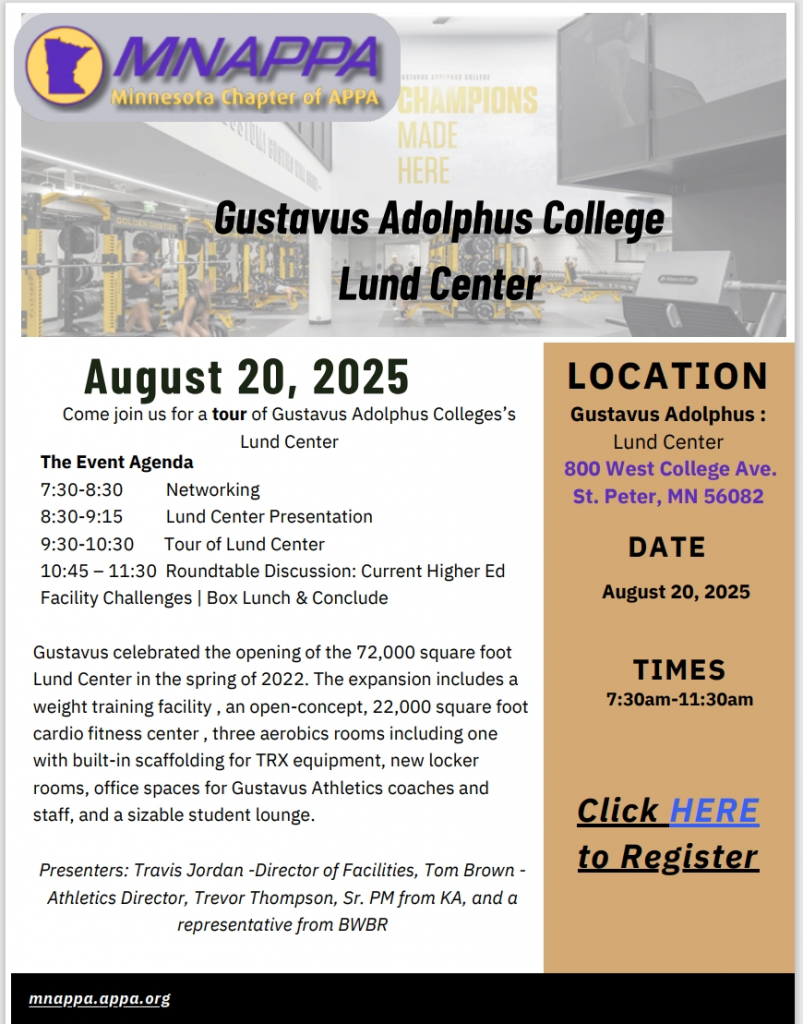 MNAPPA hosted a one day conference on the St Thomas University campus. The day consisted of presentations from BWBR on universal/inclusive design, Performa on facility assessment and maintenance planning as well as MMS on indoor air quality. Lunch, roundtable discussions, a tour of the almost completed School of Nursing building as well as a social hour to complete the day.
